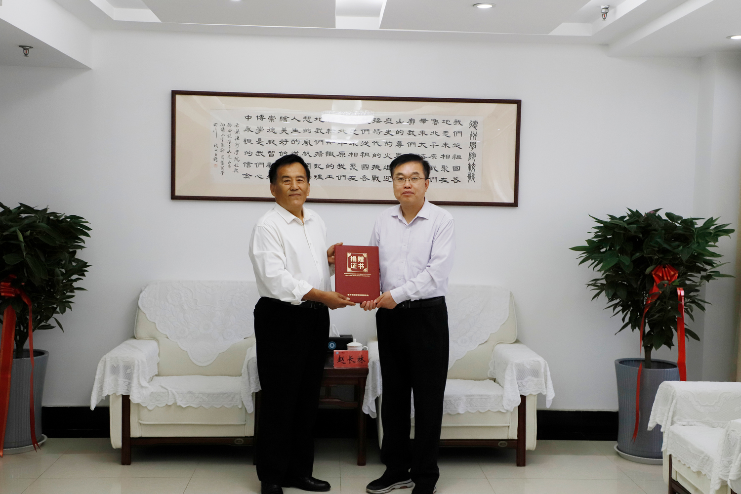 5月11日校庆日,知名画家、校友高志恩向学校捐赠画作,校长赵长林代表学校接受捐赠。