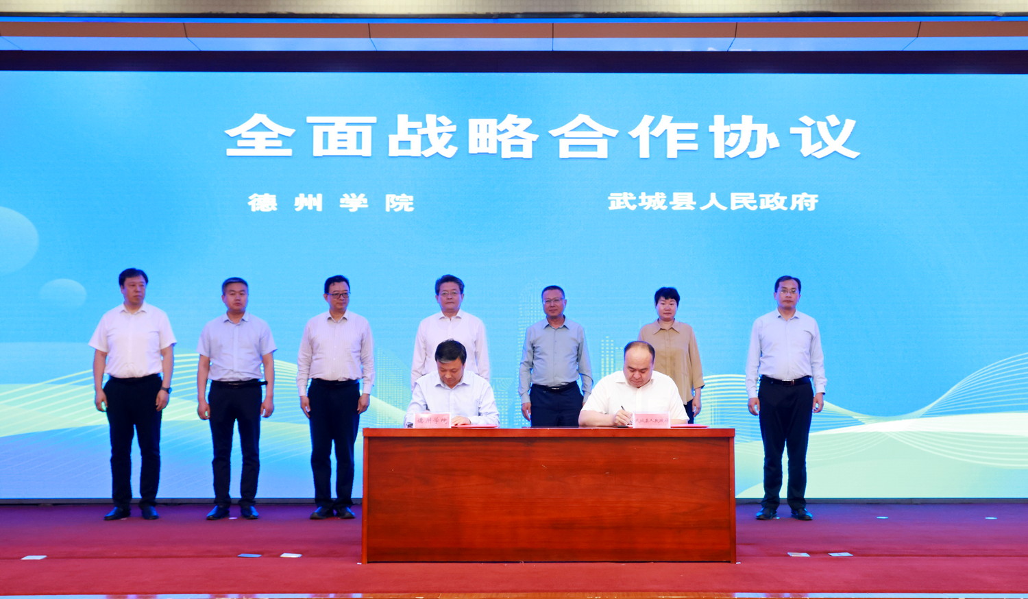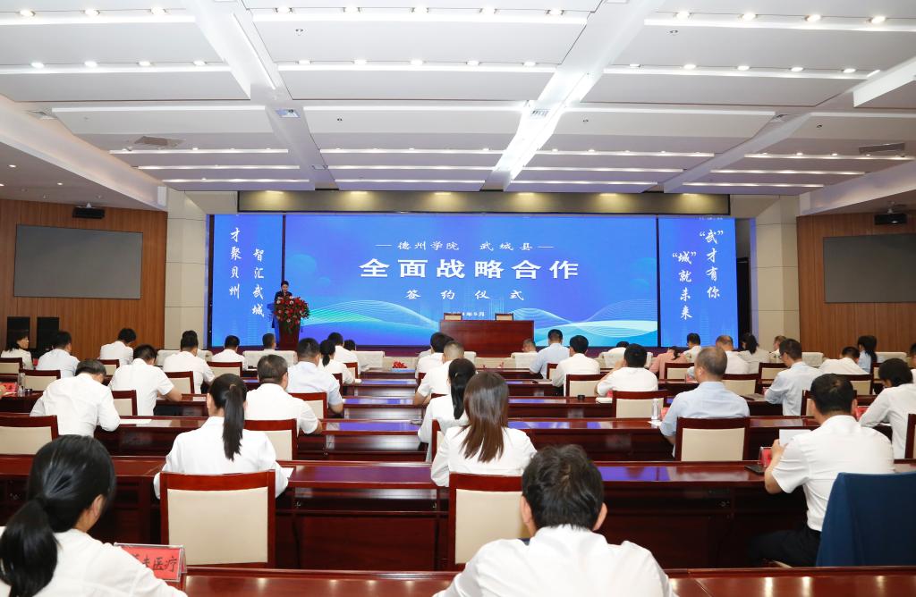 5月13日,球王会官网与武城县人民政府全面战略合作及校企合作签约仪式举行。德州市委组织部副部长、市人才事业发展中心主任周春华,县委副书记、县长王丽慧,县委常委、常务副县长李强,县委常委、组织部部长胡星海,球王会官网党委书记吴君,党委委员、副校长李甲亮出席签约仪式。