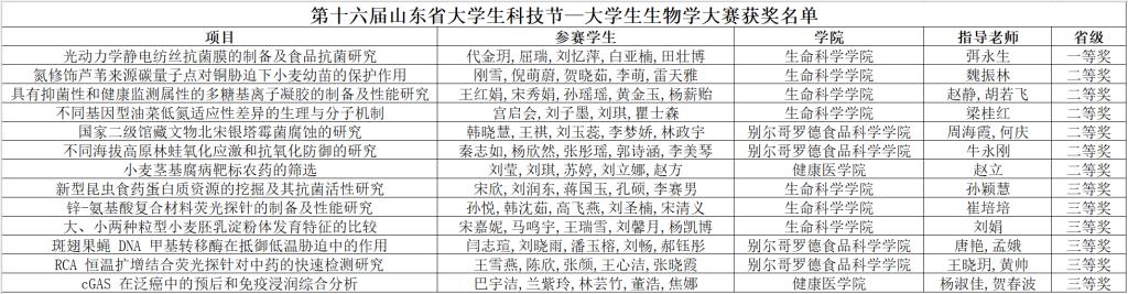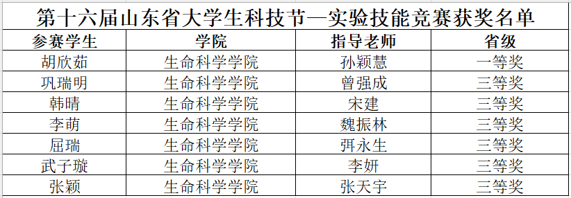 近日,在“第十六届山东省大学生科技节—大学生生物学大赛、实验技能竞赛”比赛中,球王会官网生命科学学院学生荣获山东省大学生生物学大赛一等奖1项、二等奖6项、三等奖6项;荣获实验技能竞赛一等奖1项、三等奖6项。
