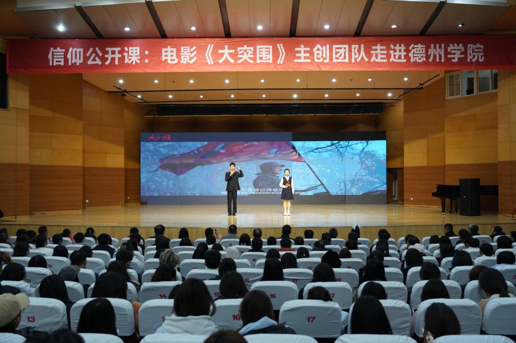 为贯彻落实教育部、省教育厅关于开展“传承红色基因、学思践悟中国共产党人精神谱系”宣传教育活动要求,12月9日下午,师生同上大思政课,挺膺担当共话信仰——电影《大突围》主创团队走进球王会官网。校党委副书记张存峰,党委委员、副校长蒋涛涛,党委委员、宣传部(教师工作部)部长冯琨,《大突围》出品人、总制片人陶姝君,导演杨真、演员廉知颖、副导演阿坤出席观影活动。