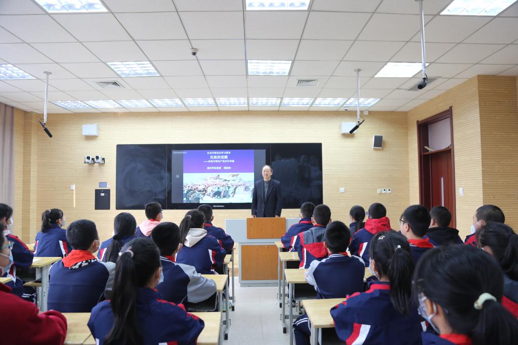 校关工委“五老”志愿者胡俊海为学校七年级的学生讲授党史教育课——《民族的觉醒》,课程运用了图片、故事等方式讲述了党诞生的光辉历程。