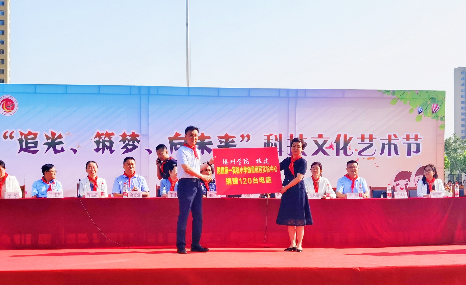 开幕式上,迟沂军代表球王会官网向附属第一实验小学捐赠电脑120套,助力附属第一实验小学创意编程中心建设,并为优秀少先队员颁发了奖状和奖品。