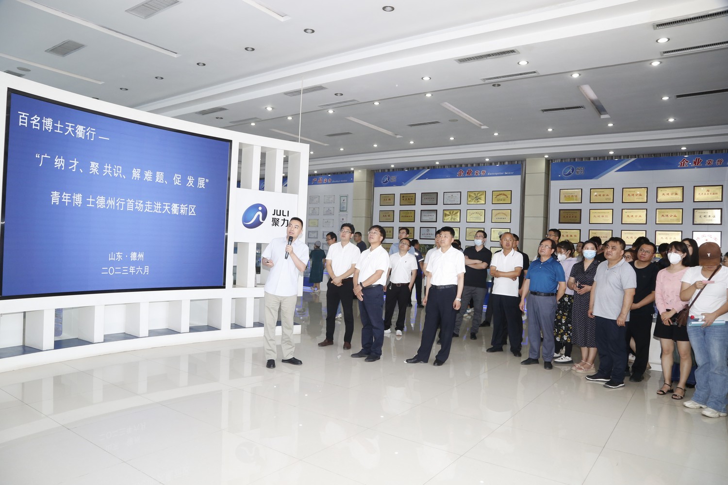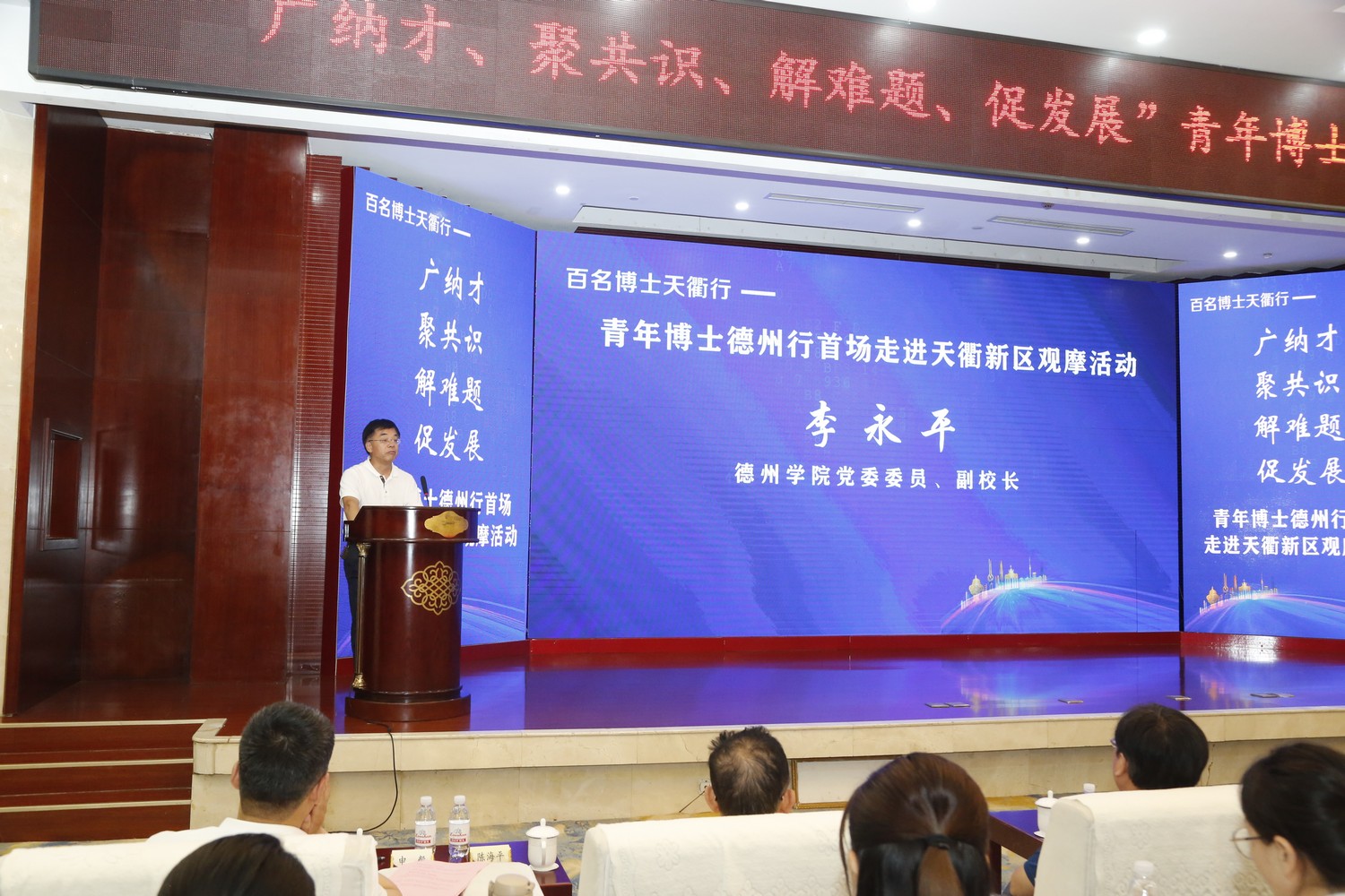 6月9日,球王会官网组织60余名博士代表参加德州市人力资源和社会保障局、德州天衢新区管理委员会主办的百名博士天衢行——“广纳才 聚共识 解难题 促发展”青年博士德州行首场走进天衢新区活动。德州市委组织部副部长、市人力资源和社会保障局局长郭洪霞,德州天衢新区党工委副书记许勇,德州市人力资源和社会保障局党组成员、副局长尚键,德州天衢新区党工委委员、党群工作部部长刘学武;齐鲁工业大学(山东省科学院)科研管理部副部长魏明志;球王会官网党委委员、副校长李永平出席。活动由德州天衢新区(德州经济技术开发区)党工委委员、管委会副主任申毅主持。