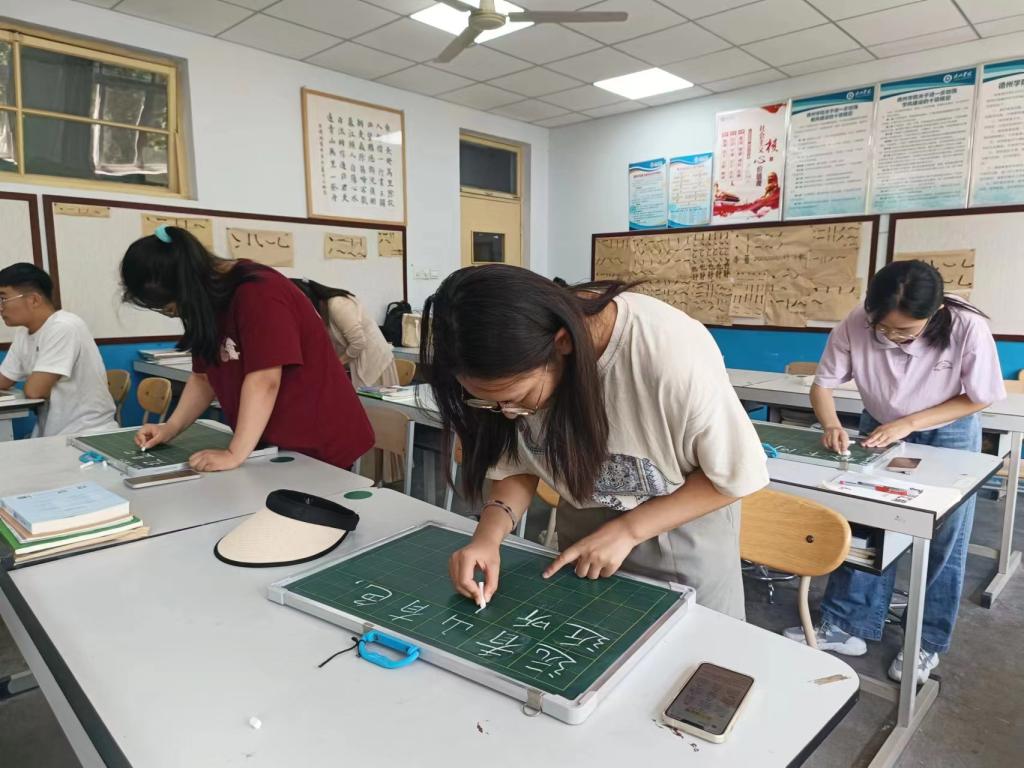 本次比赛共有钢笔、粉笔、毛笔三种形式,同学们自行组成团队,自愿参与比赛。书写过程中,同学们凝神静气,认真投入在横竖撇捺的书写之中,起笔行笔收笔清楚,字形大小匀称,比例适当,重心平稳,点画之间互相呼应,卷面整洁井然有序,充分展现当代大学生的魅力的同时,也让同学们感受到了汉字作为中华文化载体的博大精深。钢笔、粉笔、毛笔参赛作品书写完后,统一由志愿者进行评奖。