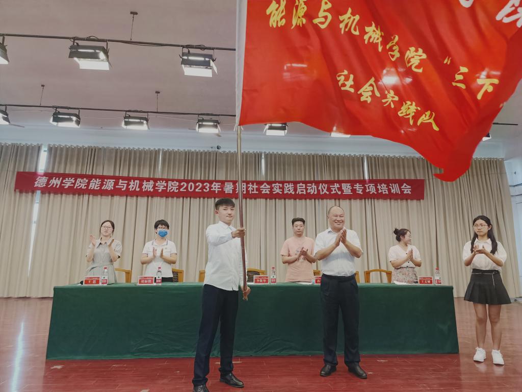 6月27日下午,能源与机械学院2023年暑期社会实践启动仪式暨专题培训会求实楼4009报告厅举行。学院党委书记向实践团代表授旗。辅导员、社会实践指导老师、300余名志愿者参加启动仪式。