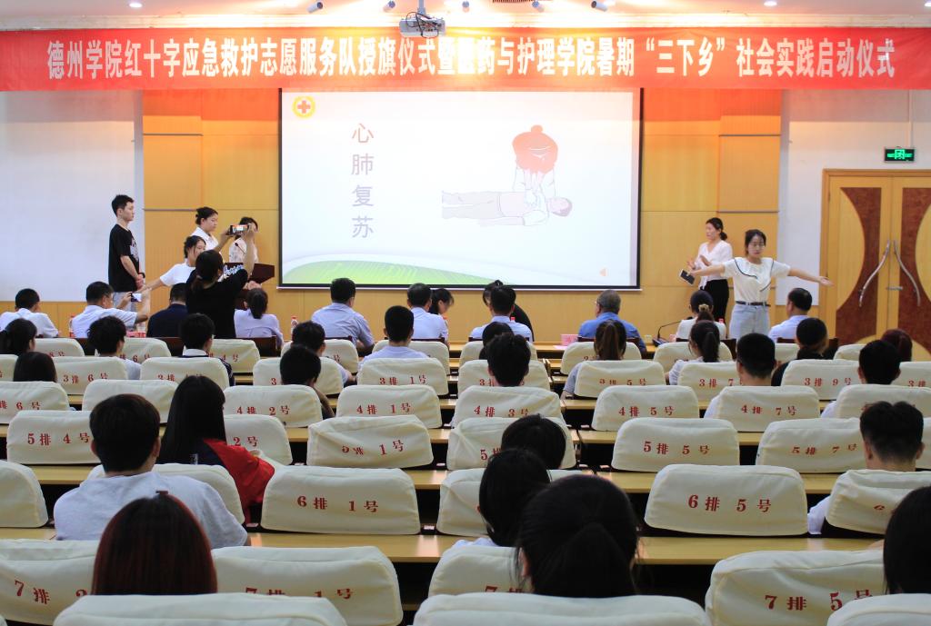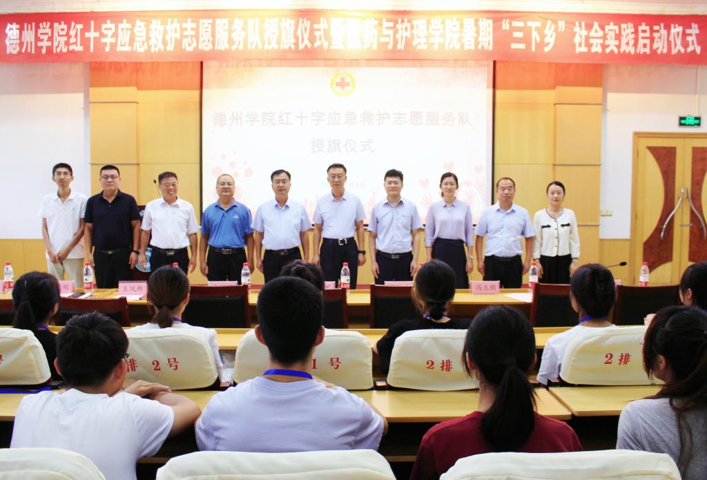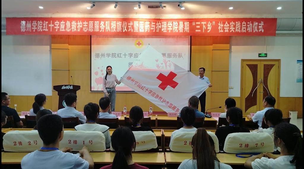 为弘扬“人道、博爱、奉献”的红十字精神和“奉献、友爱、互助、进步”的志愿服务精神,更好地推进暑期“三下乡”社会实践活动深入开展。7月6日下午,医药与护理学院于厚德楼四楼报告厅举办球王会官网红十字应急救护志愿服务队授旗仪式暨暑期“三下乡”社会实践启动仪式。球王会官网党委委员、副校长迟沂军、德州市红十字会常务副会长李福辉、德州市红十字会党组成员、副会长黄卫东出席,校团委、医药与护理学院相关负责人、市红十字会应急救护培训中心相关负责人及学生志愿者共百余人参加。
