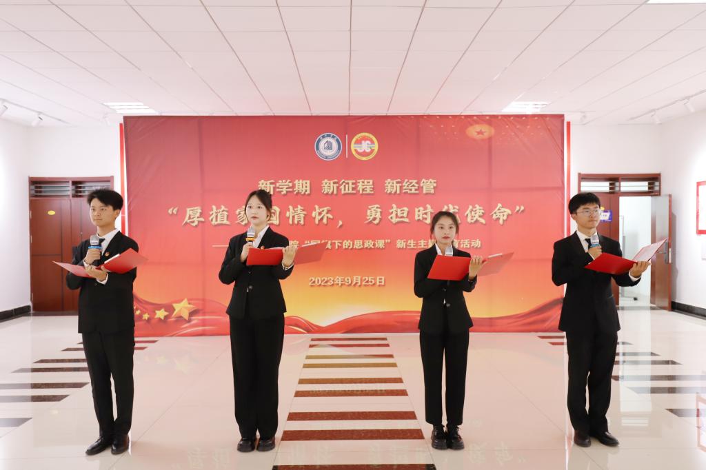 随后,由学生带来了诗歌朗诵《青春中国》,庄严的朗诵声表达着同学们对祖国的深切热爱与崇高敬意。新生代表2023级会计学本科生作了题为《奋斗正青春,逐梦启新程》的主题发言。来自2021级市场营销(春考)班的青年学生代表作了题为《淬炼意志品质,创造出彩青春》的主题发言,号召广大青年坚定理想信念,深学细悟党的创新理论,以实际行动建功新时代。