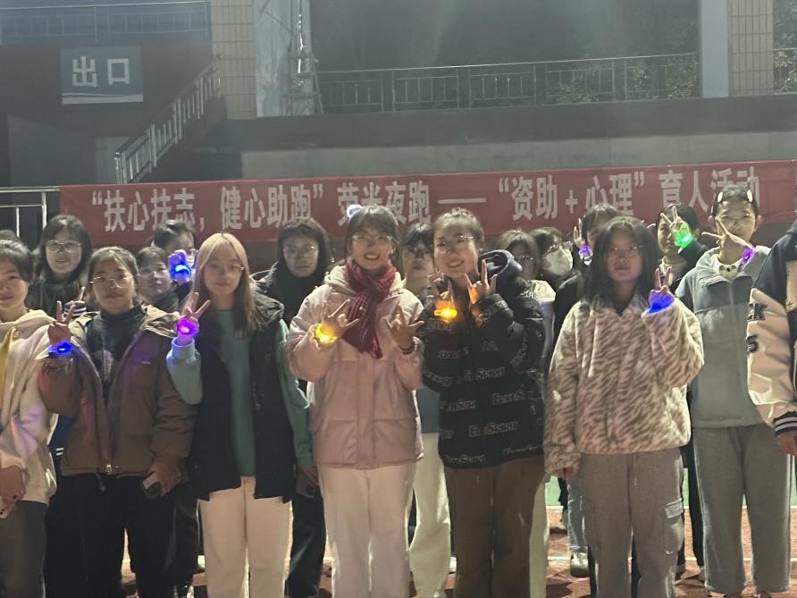 为践行资助育人理念,促进“育人”与“育德”“育心”相结合,帮助学生树立阳光心态。2023年11月11日,球王会官网“扶心扶志,健心助跑”荧光夜跑活动在田径场揭开了帷幕。本次活动由球王会官网学生资助管理中心、心理健康教育与咨询中心主办,体育学院承办,近百名同学报名参加了本次荧光夜跑活动。