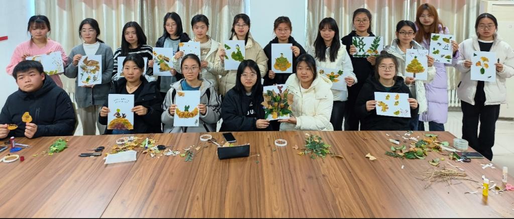 在树叶贴画心理减压活动中,同学们根据自己的兴趣和爱好随机配对组合,根据叶子的形状与颜色,通过剪、粘、画等方式,设计出了一幅幅别出心裁、不拘一格的树叶贴画。在作品设计完成后,各小组依次分享自己的创作灵感和思路,大家用心创造的佳作成为了秋日最美的表达。最后,同学们把贴画放进相框,进行合影留念,为大学生活留下美好的瞬间。