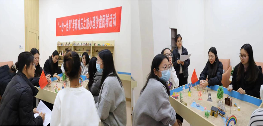 在考研减压团体心理沙盘活动中,主持人对大家放入沙盘中的沙具所产生的心理进行一一讲解,对同学们做出适当的指导并给予放松心态的建议。随后,主持人引导同学们进行沟通交流,一起分享交流沙盘活动的心得与收获。