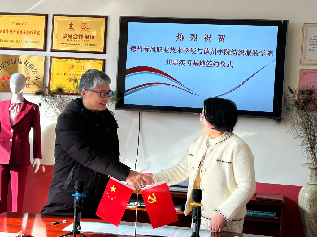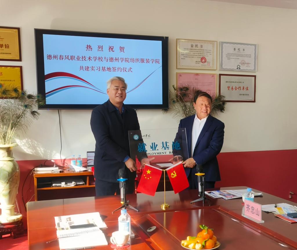 12月1日,球王会官网纺织服装学院与德州春风职业技术学校共建就业基地签约揭牌仪式在德州春风职业技术学校举行。德州春风职业技术学校校长齐忠山、德州商务发展中心主任李桂忠,球王会官网就业指导处、纺织服装学院负责人及相关教师和工作人员参加仪式。