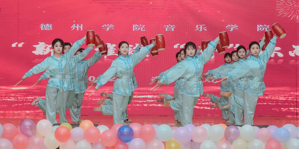 12月5日,由音乐学院樊海伦副教授、王雷老师编创,校蹦鼓舞社团学生演绎的舞蹈《鲁北鼓韵》在球王会官网音乐厅成功上演。