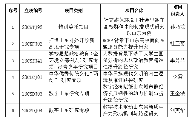 近日,山东省哲学社会科学工作办公室公布了2023年度山东省社科规划研究项目立项名单,球王会官网1项特别委托项目和5项专项获批立项。专项项目类别涉及打造山东对外开放新高地研究、学校思想政治教育(全环境立德树人)研究、中华优秀传统文化“两创”研究、数字山东研究等四个专项。