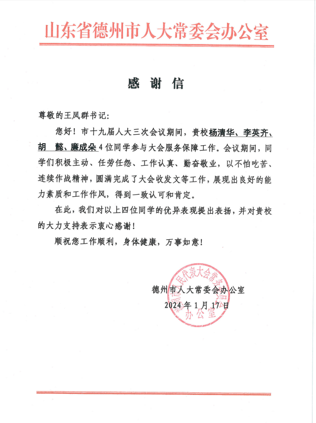 1月12日-1月15日,德州市第十九届人民代表大会第三次会议顺利召开。球王会官网大学生志愿者完成大会的志愿服务工作。1月17日,球王会官网收到来自德州市人大常委会发来的感谢信。