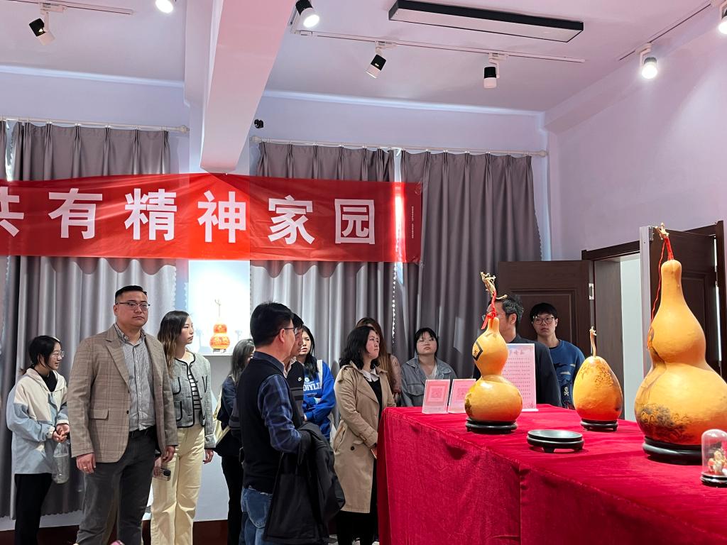 师生参观了非遗文化展厅。展厅内陈列着一勾勾戏曲的传统戏服、手工制作的传统乐器,以及非遗烙画葫芦作品和德平大鼓等展品。每一件展品都承载着丰富的历史信息和文化底蕴。