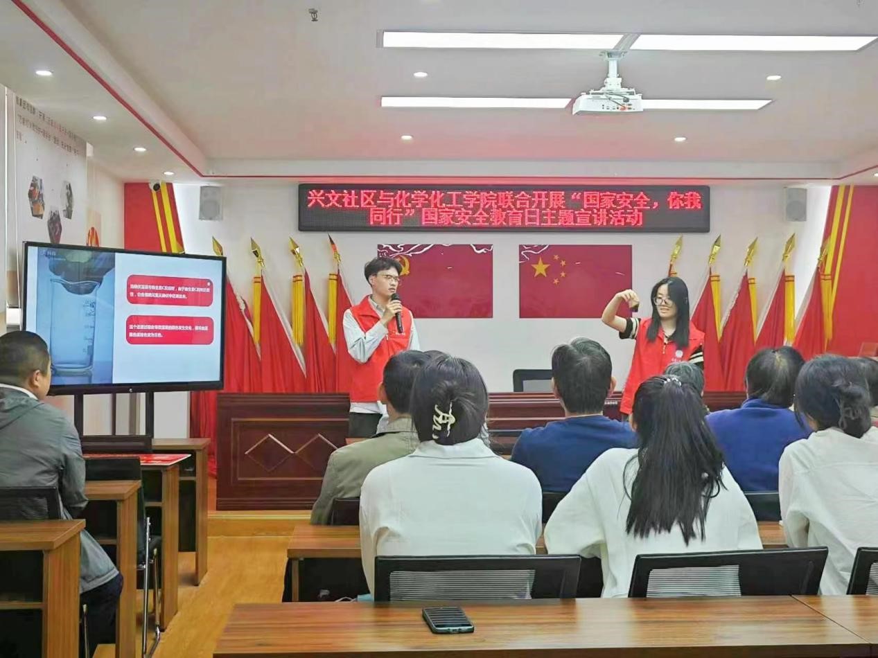 为增强社区居民的国家安全意识和素养,营造和谐平安的社区环境。在全国第十个国家安全教育日来临之际,化学化工学院志愿者赴兴文社区开展“国家安全,你我同行”普法宣传活动。化学化工学院正青春低碳环保科技志愿服务队队员主讲,兴文社区居民参加。