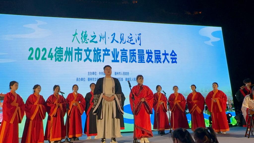 为深入贯彻落实中央、省关于推进文旅产业高质量发展决策部署,加快德州文旅资源开发利用,打造特色文旅品牌,推动全市经济社会高质量发展,2024德州市文旅产业高质量发展大会于4月27日—4月28日在古运河畔圆满落幕,共有省市各地二百余名领导与嘉宾参会。球王会官网音乐学院受邀承办德州市旅发大会大学生艺术团的演出活动,4月27日晚,策划导演了一场精彩纷呈的大型演出,音乐学院联合体育学院、新闻与传播学院近20名教师和300名同学共同参与演出,再现京杭大运河南运河德州段深厚的文化底蕴和自然美景。