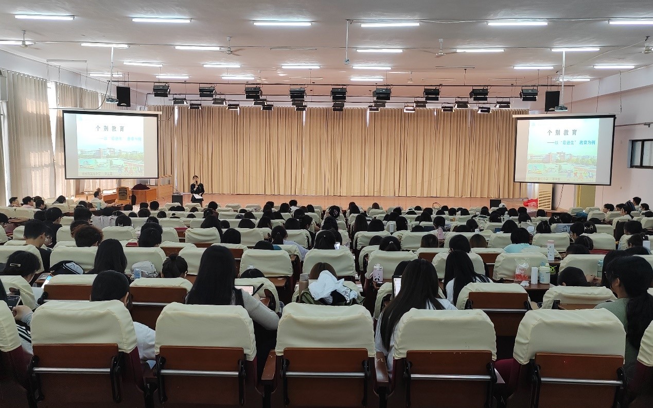 讲座中,李玉霞以“后进生”教育为例,围绕班主任身份角色的转变,从“强制者”到“改造者”,再到学生的“陪伴者”“温暖者”与“全能者”,通过讲述生动形象的典型案例,深入剖析了班级管理过程中学生的身心发展变化,点明班主任工作中存在的个别教育误区。同时,对学生提出期望,希望各位同学成为“充满爱心、保持信心、坚守恒心”的“四有”好老师。全体学生认真听讲,专心记录,纷纷表示,在李玉霞身上看到了榜样的力量,对班主任岗位职责及德育工作有了更深入的了解,同时也掌握了更多实用的班级管理技巧,对教师这个职业有了新的思考和认识。
