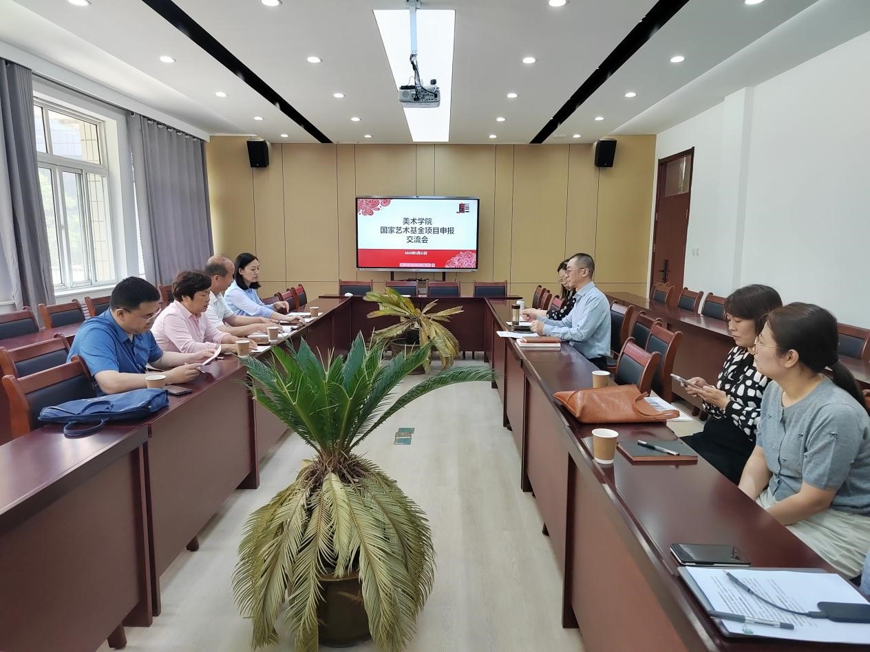 5月21日,美术学院召开国家艺术基金项目申报交流会,会议邀请德州市文化和旅游局党组成员、副局长李宝国、德州梁子黑陶文化有限公司董事长梁丽霞,校科研处相关负责人参加。