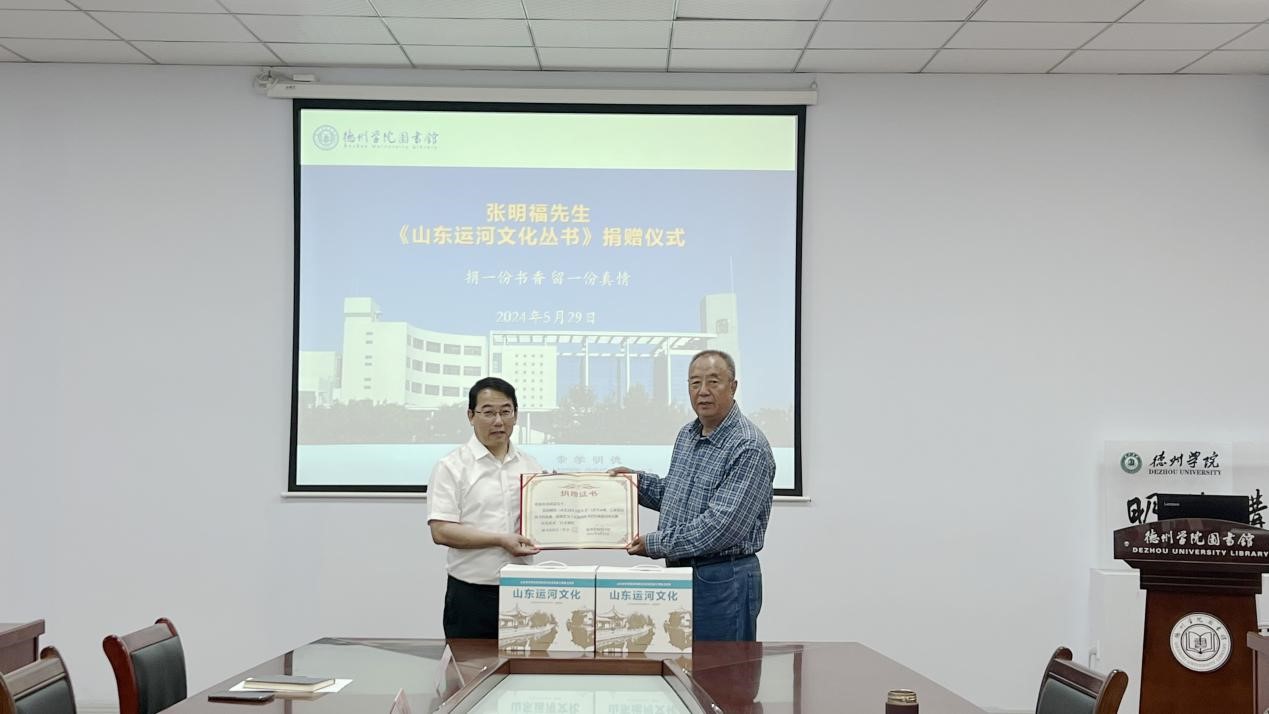 张明福向学校捐赠了其参与编写的《山东运河文化丛书》两套,学校党委委员、副校长单振涛代表学校接受了捐赠,并向张明福颁发荣誉证书,球王会官网图书馆负责人及部分馆员代表参加了捐赠仪式。