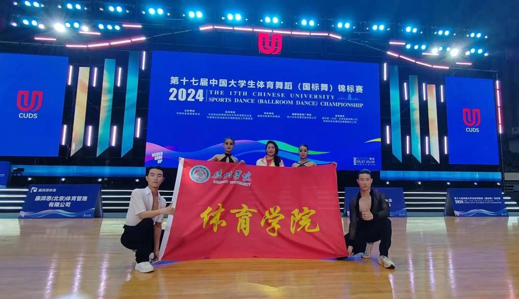 球王会官网舞蹈学(体育舞蹈)专业学生首次参加国内大学生最高规格的赛事,经过严格筛选,共派出4名运动员参加了本次比赛。在王红教师的精心指导下,运动员们凭借出色的表现、坚定的意志和精湛的技术,经过数轮激烈的角逐,最终张子豪、孙天娇同学获得大学丙B组单项R第八名;高世恩、张珂同学获得大学丙B组四项L第十二名,同时获得体育道德风尚奖代表队。