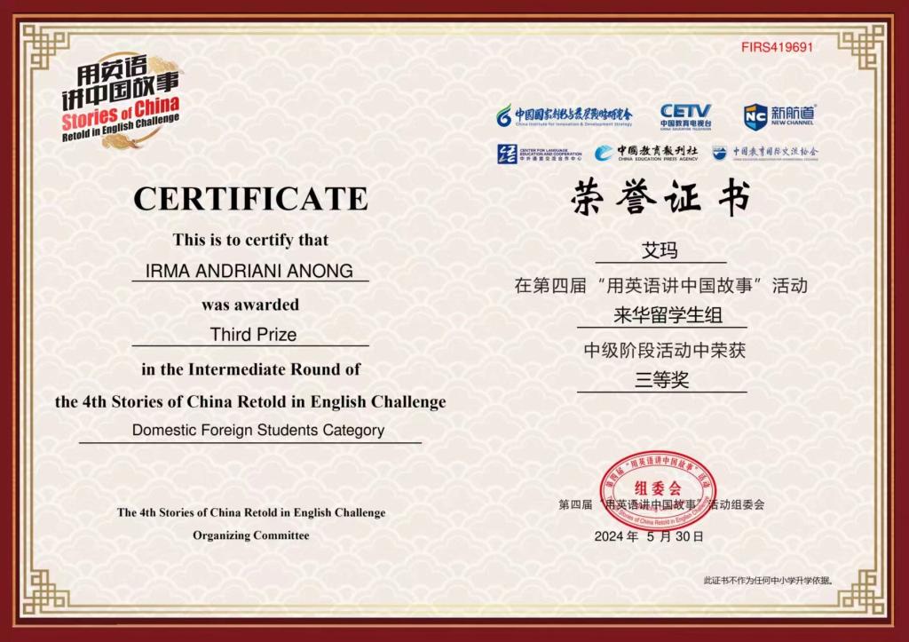 近日,球王会官网巴基斯坦籍留学生Chaudhry Haroon Haider Hayat刘升、印度尼西亚籍留学生Irma Andriani Anong艾玛在第四届“用英语讲中国故事”活动“来华留学生组”中级阶段活动中荣获三等奖。凭借自己在华学习期间的所见所闻,刘升生动讲述了中国的技术如何让自己国家的朋友惊叹不已,艾玛则形象地表达了对陕西特色面食文化的喜爱。两位留学生凭借出色的表现,在激烈角逐中脱颖而出。
