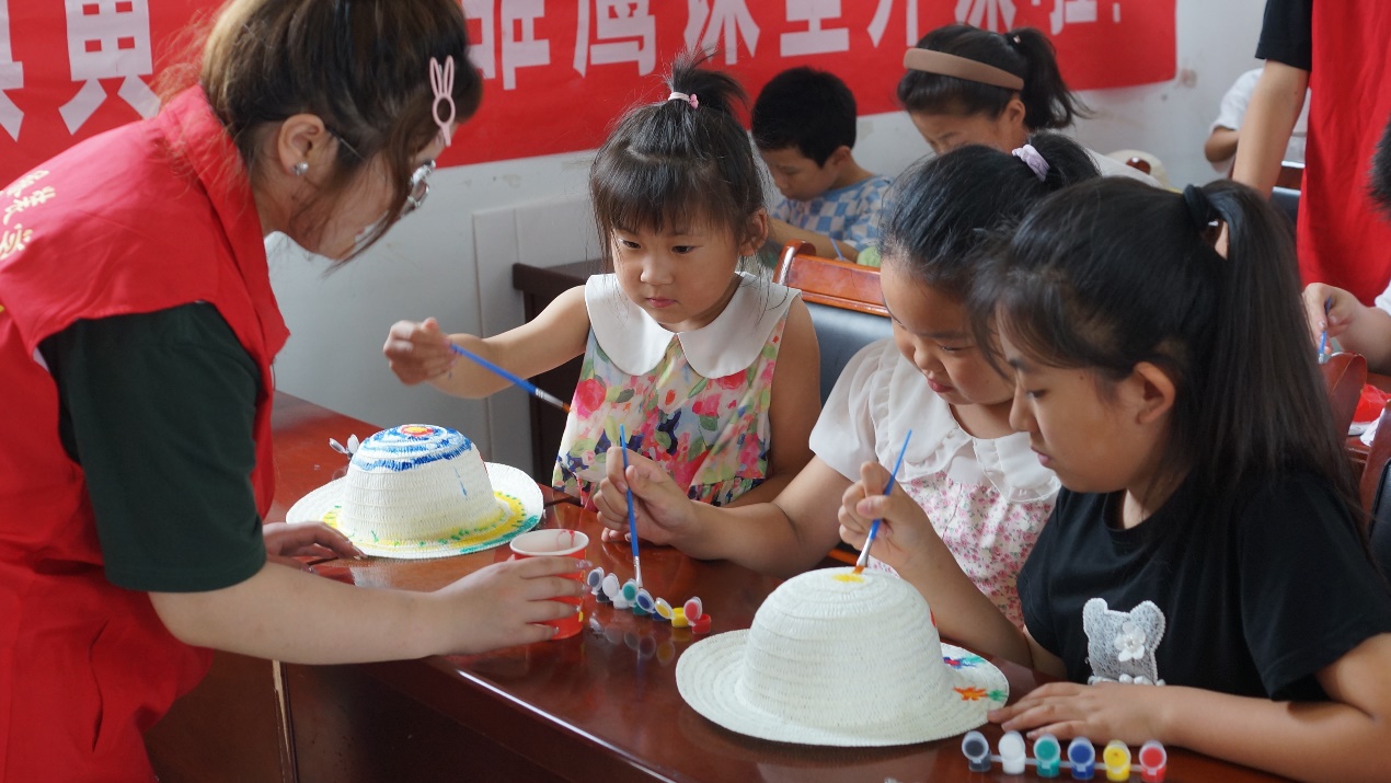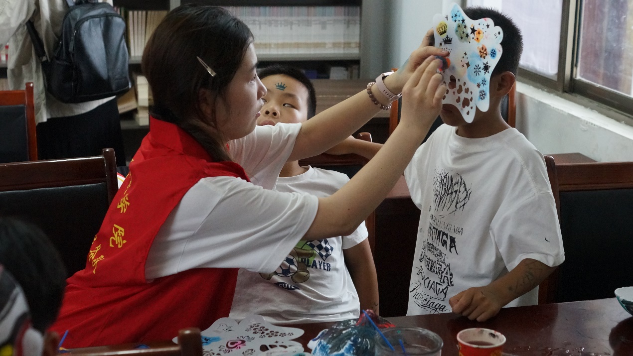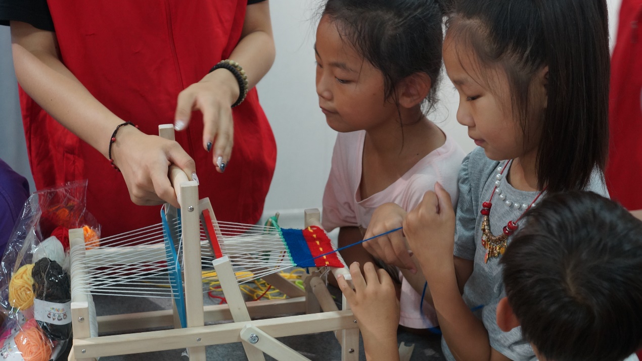 随后,志愿服务团一行人分别在鲁源新村和黄土村为居民及小朋友们开展了一系列以“传承鲁锦织造”为主题的志愿服务活动。志愿者首先为居民们讲解了鲁锦的历史起源、织造特色以及制作工艺等知识,然后现场演示了如何运用小型织布机编织出色彩斑斓、纹理独特的鲁锦布料。为了进一步加深大家的体验与理解,志愿者们则化身为耐心的导师,手把手教授大家鲁锦的织造技艺,从最基本的打结、穿线到复杂的图案编织,每一个步骤都讲解得细致入微,让大家亲身体验到了鲁锦文化的独特魅力。此外,志愿者们还结合自身服装与服饰设计专业特色优势,不仅耐心地为居民们提供个性化的服装搭配建议与形象设计咨询,还为小朋友们举办特色面部彩绘、鲁锦草帽设计等活动。